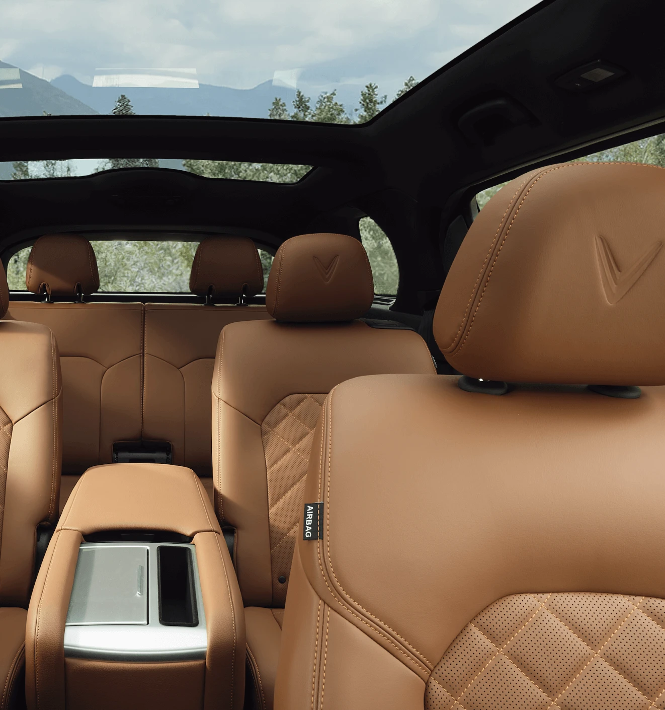 Ngôn ngữ thiết kế tối giản mang hơi hướng tương lai phối hợp cùng loạt vật liệu cao cấp, thân thiện với môi trường, VF 9 đem lại trải nghiệm nội thất khoáng đạt, thư thái trên mọi hành trình.